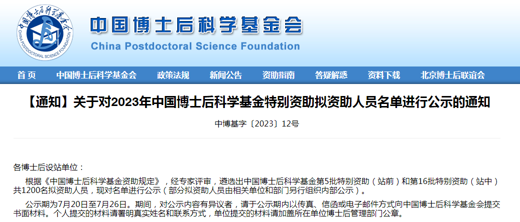 关于对2023年中国博士后科学基金特别资助拟资助人员名单进行公示的通知