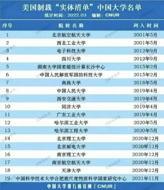 在美国制裁“实体清单”中国大学名单中,我国排在第一位的是北京航空航天大学,早在2001年5月已被列入,北京航空航天大学简称北航,坐落在首都北京,是我国985工程、211工程、双一流建设高校,也是全国航空航天类大学中的“王者”,打遍全国无敌手。排在第二位的是西北工业大学,也是在2001年5月份时被列入的,西北工业大学简称西工大,坐落在陕西省西安市,是陕西省三所985院校之一,也是西北地区排名第二的重点院校。在过去的很多年里,西北工业大学虽然实力强悍,但因为地理位置的缘故,录取分数线一直不是太高,可是金子总会发光,黄沙无法掩盖钻石的光芒,西北工业大学还是在困难的环境中趟出了一条路。西工大为我国国防建设重要贡献,也是“大国工匠”榜单上最主要的成员,随着学生和家长们越来越慧眼识珠,西北工业大学的录取分数线和受欢迎程度也都越来越高了。排在第三位的是电子科技大学,坐落在四川省成都市,于2012年9月被列入,电子科技大学是985工程、211工程、以及双一流建设高校,凭借优越的地理位置和强悍的综合实力,在高考中深受欢迎。排在第四位的是四川大学,也是在2012年九月被列入的,简称川大,位于四川省成都市,是整个西南地区综合实力排名第一的高校;排在第五位的是湖南大学国家超级计算长沙中心;第六位是中国人民解放军国防科技大学,简称国防科技大学,坐落在湖南省长沙市,这两位都是在2015年二月被列入的。第七位是南昌大学;第八位是中国人民大学;第九位是西安交通大学;第十位是同济大学;第11位是广东工业大学;第12位是哈尔滨工业大学;第13位是哈尔滨工程大学;第14位是北京理工大学;第15位是北京邮电大学;第16位是南京理工大学;第17位是南京航空航天大学;第18位是天津大学;还有第19位中国科学技术大学合肥微尺度物质科学国家研究中心,分别在2018年五月至2021年11月间被列入。在名单中,我国了不起的“国防七子”赫然在,分别是哈尔滨工业大学、西北工业大学、哈尔滨工程大学、南京航空航天大学、北京航空航天大学、北京理工大学、以及南京理工大学。除此之外,许多平民院校的表现也非常出色,比如同济大学、中国人民大学、广东工业大学、电子科技大学、南昌大学等,虽然不在国防七子之列,但还是为我国的国防建设重要贡献。登上这份名单的中国大学,虽然只有一部分985,也只有一部分211,并且还不是985和211中综合实力最强悍的,但他们却是我国最不可缺少的一批大学,这些大学从创办至今,已经培养出了源源不断的优秀人才,投身于各个国防建设领域,也为国家和社会的发展作出了重要贡献。这些大学是真正意义上的好大学,不仅好在实力强悍,也不仅好在拥有诸多重点头衔,更好在口碑,好在在学生和家长心目中的独特地位,虽然不是人人都能考上这些大学,但在我们大部分人心中,他们都是我国最好的一批大学。