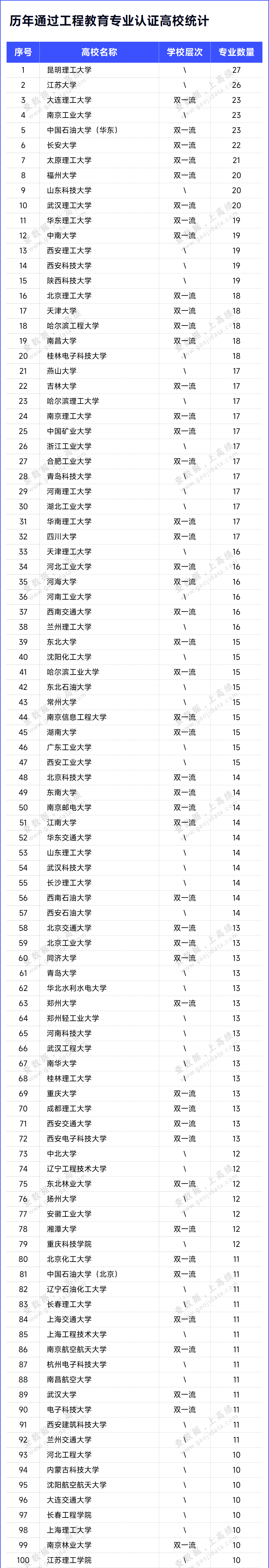 昆明理工大学有27个专业通过认证,是目前全国高校中通过认证专业最多的;江苏大学紧随其后,有26个专业通过认证;大连理工大学、南京工业大学和中国石油大学(华东)各有23个专业通过认证,并列第三;长安大学和太原理工大学也有超过20个专业通过认证。具体统计情况如下: