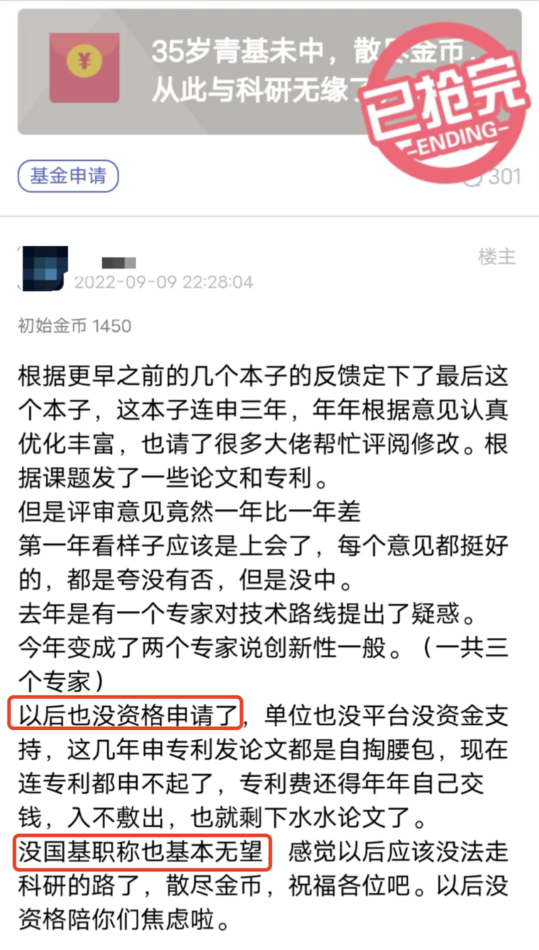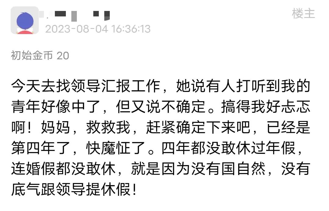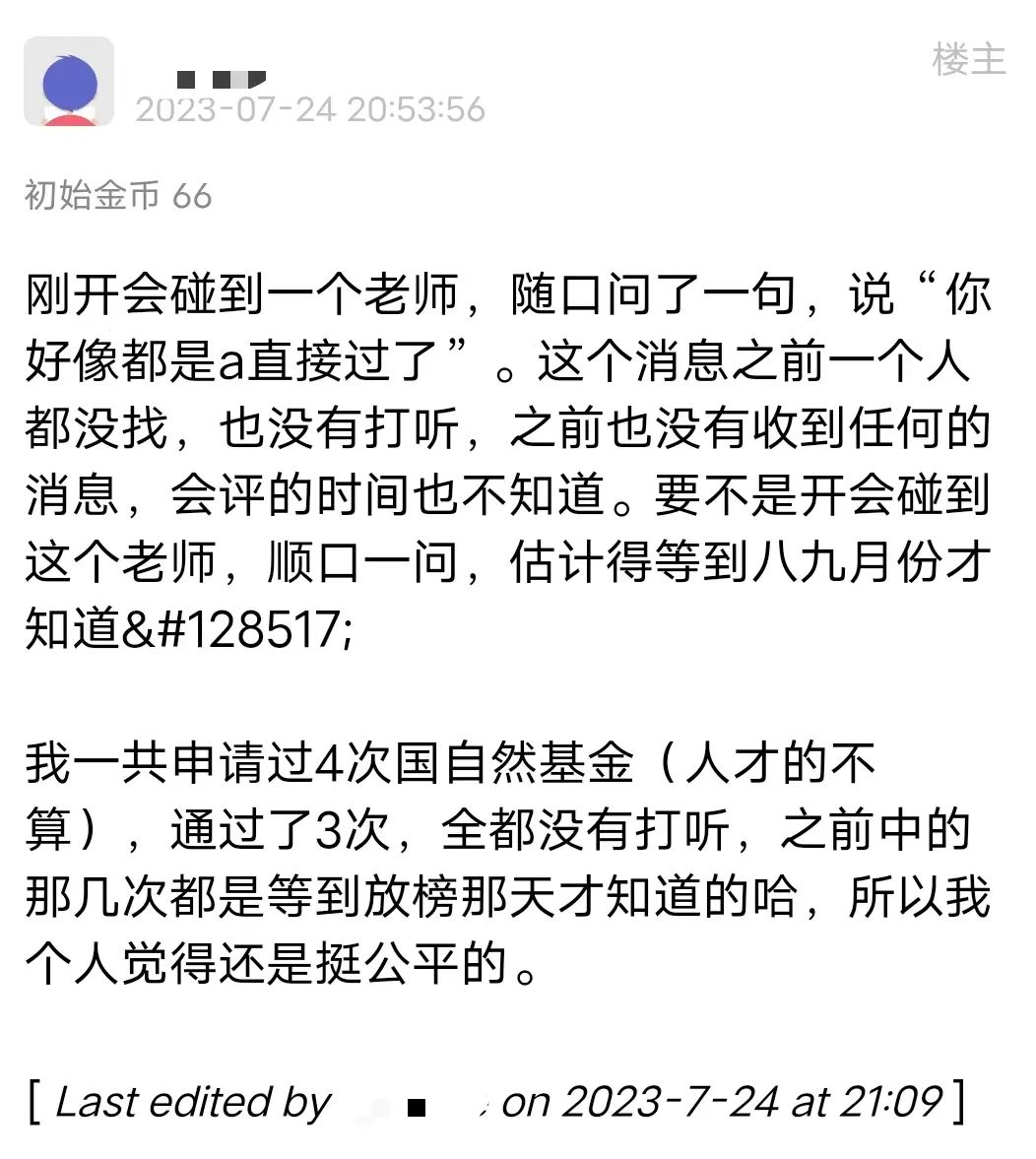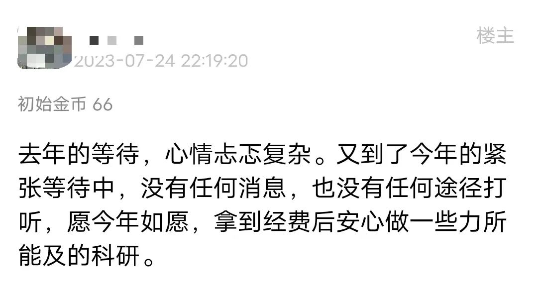 每年的8月,“青椒”们集体在网络上“祈福散金”,焦灼地等待今年国自然的结果。在辗转难眠的深夜,忍不住爬起身来再看看自己的本子;或是反复登录国自然系统,只求给一个痛快的结果:今年我的本子是中,还是没中?奋战国自然已到第四年的某位“青椒”分享道:“今天找领导汇报工作,她说有人打听到我的青年好像中了,但又说不确定。搞得我好忐忑!因为没有国自然,已经四年没敢休年假了,没有底气跟领导提休假。”图 | 没有国自然,没有底气跟领导提休假的“青椒”一位申请过4次国自然,3次均通过的“青椒”,在7月底已经得知自己今年中基金的消息。这位“青椒”表示,此前申请基金全都没有打听过,都是放榜当天才知道,“国自然还是挺公平的”。没有听说任何消息的“青椒”们,也在惴惴不安地猜测国自然放榜时间,只求一个好结果。按照往年公布的时间来看,今年国自然基金项目评审结果大概率也会在8月中旬公布。