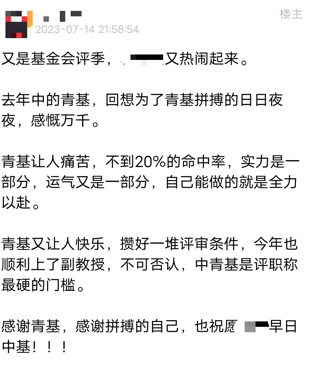 前一年中了青基,今年评上了副教授的“青椒”感慨“中青基是评职称最硬的门槛”。