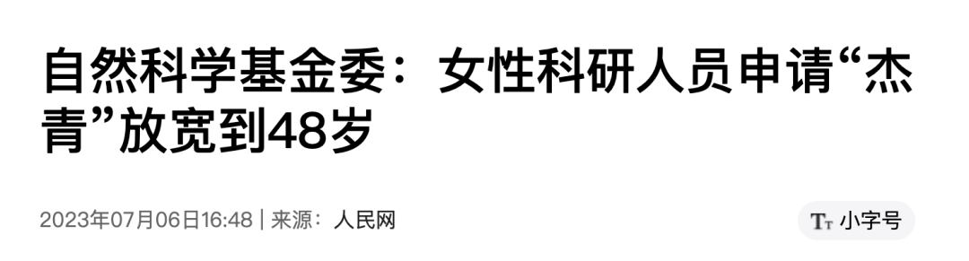 今年7月,国家自然科学基金委员会党组召开会议,审议通过进一步加强对女性科研人员支持的建议。会议明确,从2024年起,将女性科研人员申请国家杰出青年科学基金项目的年龄限制由45周岁放宽到48周岁。