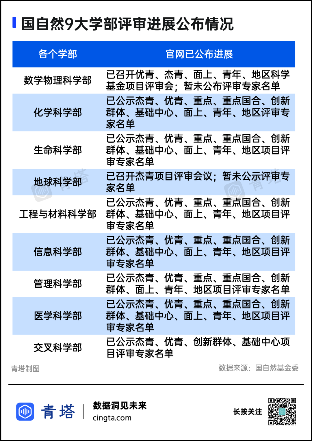 据青塔统计整理,目前国自然多个学部已经召开项目评审会或是公示了评审专家名单。除数学物理科学部和地球科学部外,其余七个学部均已公示了评审专家名单。据辽宁日报5月报道,2023年的青年项目、杰青项目和优青项目申请量都有所增长。国家自然科学基金委的统计数据显示,2023年青年科学基金项目申请量为134305项,较2022年增加5111项,增幅为3.96%;优秀青年科学基金项目(含港澳)申请量为7726项,较2022年增加627项,增幅为8.83%;杰出青年科学基金项目申请量为5141项,较2022年增加529项,增幅为11.47%。31岁至35岁年龄段的申请人最多,占35.31%。与逐年增长的申请量相对应的,自然是逐年走低的资助率。2022年,国自然共受理集中申请的项目292927项,最终资助48317项,平均资助率仅为16.73%。近5年里,青年科学基金项目的资助率从2018年的20.54%,降至17%左右;国家杰青、优青项目的资助率,一直低于10%。“医学口、37岁无青基、心态已崩,躺平了,安心当个技术员。”每过一年,“青椒”们能申请青年基金的机会就少了一次。根据国自然申请规定,青年基金项目的申请年龄为:男性不得超过35周岁;女性不得超过40周岁。青年基金设置年龄限制的初衷是为了鼓励青年科研人员,本意是为了打破论资排辈,但这一限制逐渐也加大了青年科研人的压力。