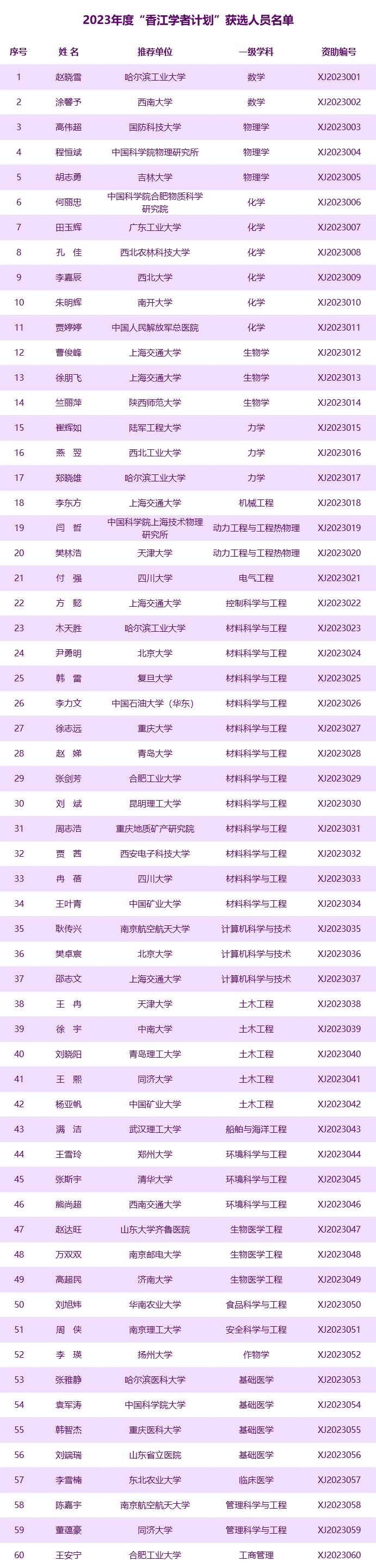 根据《全国博士后管委会办公室与香港学者协会联合培养博士后研究人员计划协议书》的规定,全国博士后管委会办公室和香港学者协会分别于今年5月和7月在北京和香港组织专家对2023年度“香江学者计划”申请者进行评审,最终确定60名获选人员(名单见附件)。