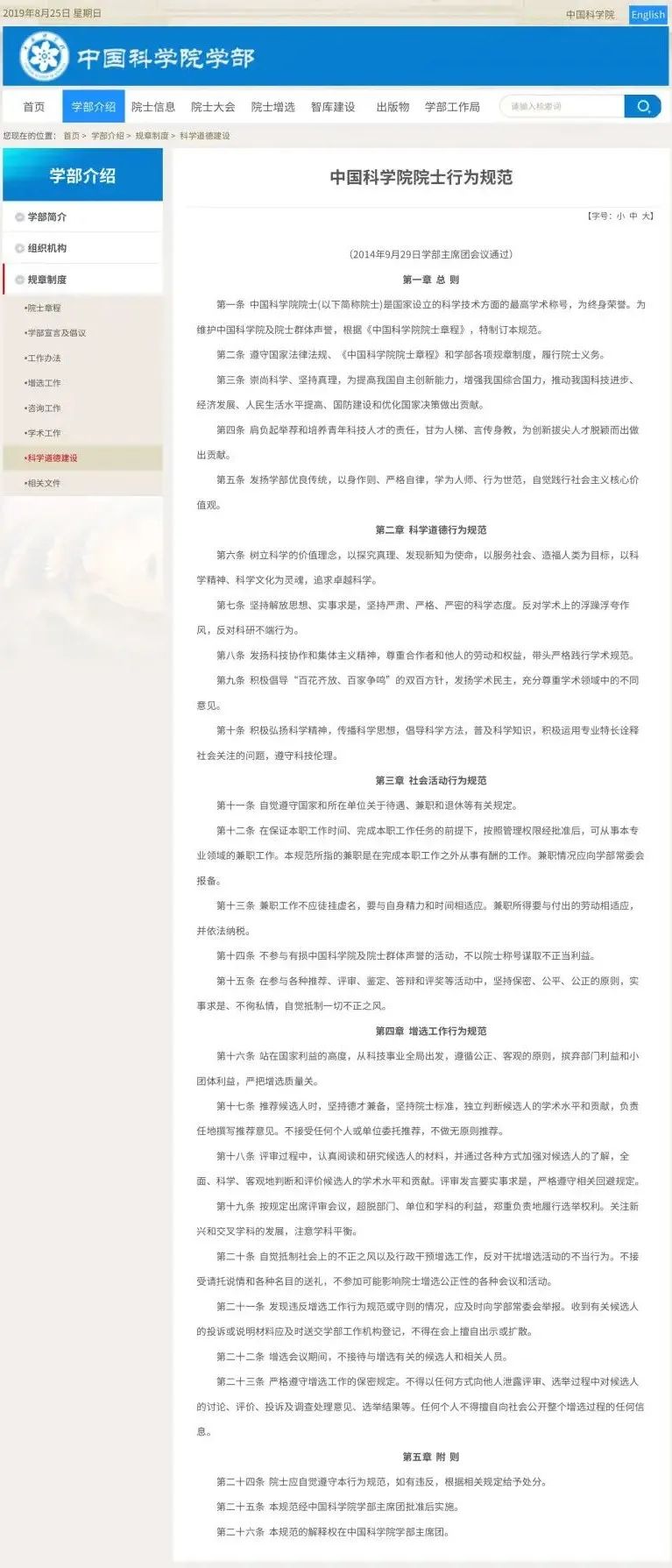 第五条 做坚守学术道德、严谨治学的表率。发扬中国科学院学部(以下简称学部)优良传统,弘扬追求真理的求实精神,以身作则、严格自律,坚持立德为先、诚信为本、敬业奉献、淡泊名利,自觉践行社会主义核心价值观,引领社会良好风尚。