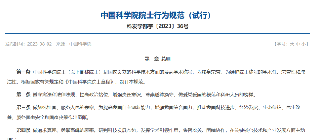 近日,中国科学院网站发布了新版《中国科学院院士行为规范(试行)》,相比此前的版本,新版内容由26条增加到33条。在科研活动行为规范里明确:聚焦主责主业,发挥学术引领作用。在职院士要坚持在本人专业领域科研一线开展工作,用于科技创新和研发活动的时间一般不少于三分之二,深入基层和一线解决实际问题。