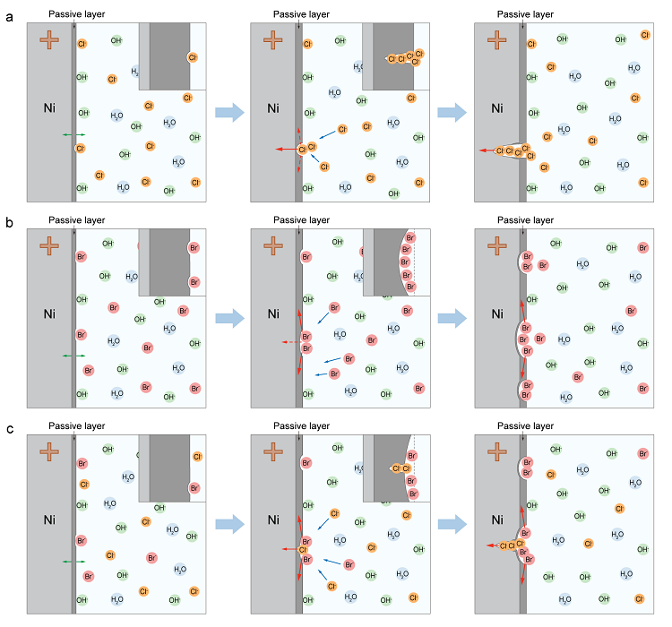 图3. 镍基底在含Cl-和含Br-溶液中的腐蚀机理。图片来源:Nat. Commun.