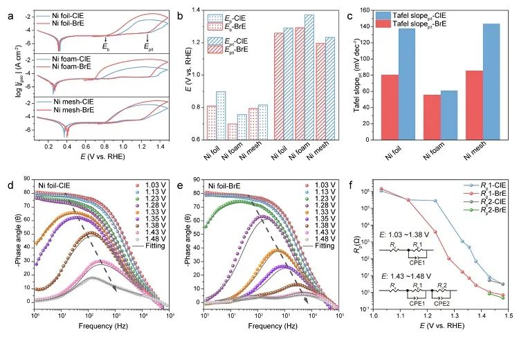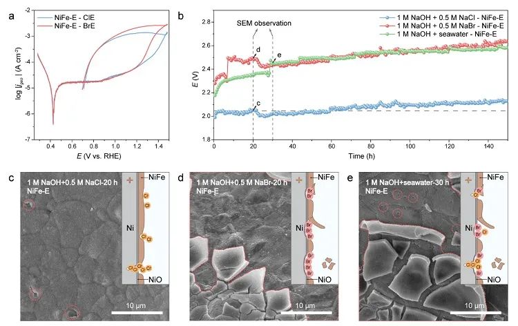 图5. NiFe/Ni阳极在含Cl-、含Br-溶液和海水中的腐蚀。图片来源:Nat. Commun.