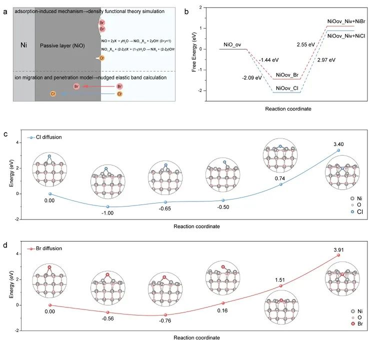 深入的机理分析表明,Cl-有更低的扩散势垒,更容易扩散进入基底钝化层进行腐蚀,而Br-与钝化层反应的自由能更低,倾向于多位点快速腐蚀。