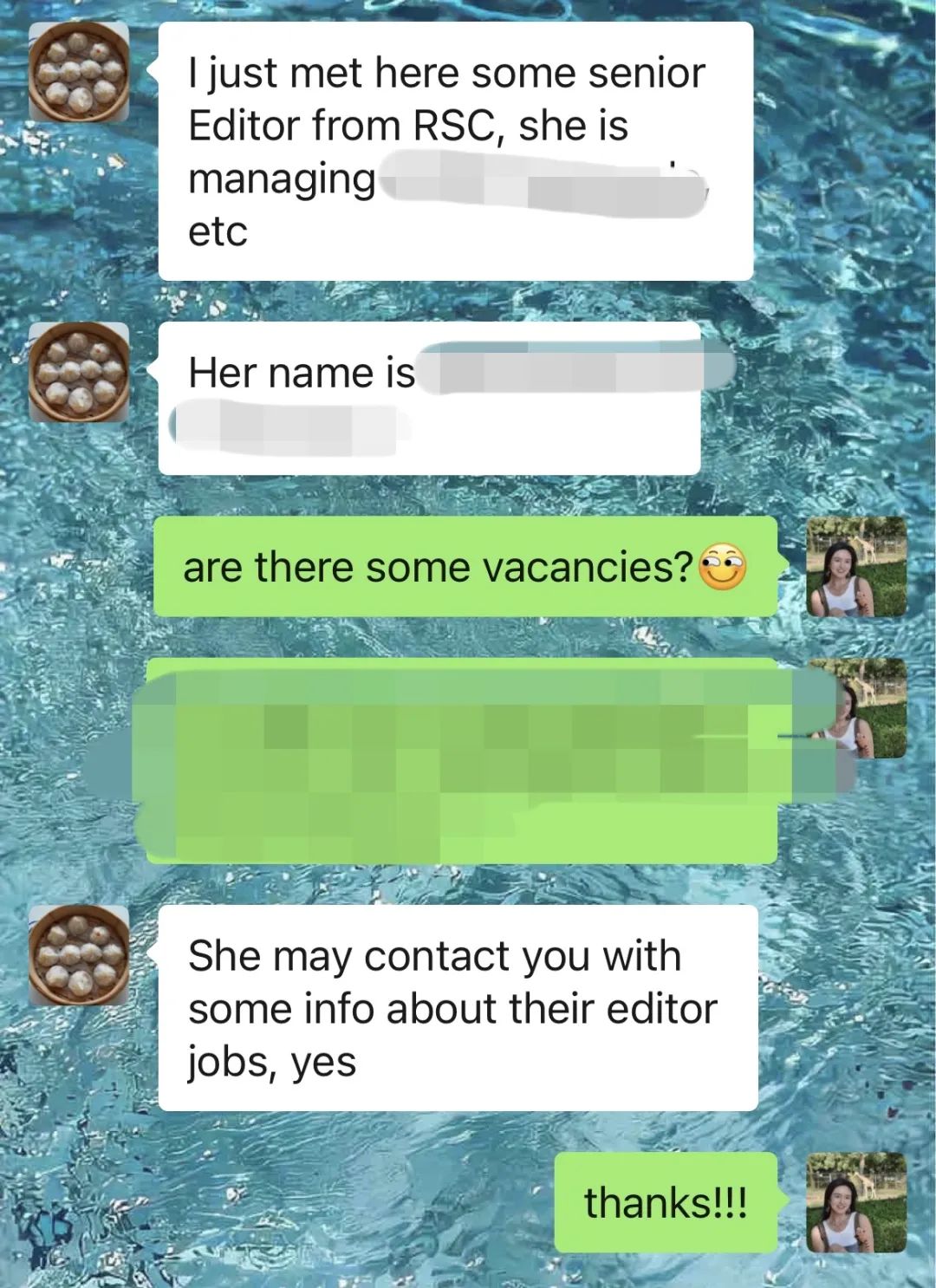 "前不久,一位新朋友私信我,好奇我之前的博导是否真的和蔼可亲、组里氛围和谐。毕业已经两年多了,但我不假思索地回应说“是的,至少我是这么认为的”。的确,科研圈中存在着一小部分“神仙导师”,他们不会催促学生996,而是井然有序地开展研究,成果斐然。他们严于律己,但尊重学生的选择,鼓励学生走出去参加会议交流。毕业后,他们仍关心学生的个人发展并给予支持。上个月,我的博导在出差期间还为我推荐了一个编辑的职位,令我心存感激和敬意。"