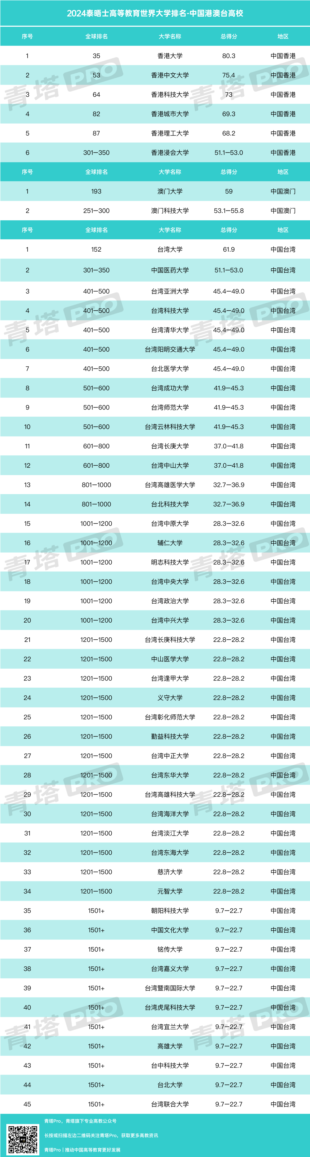 多所中国港澳台高校也上榜本次世界大学排名,香港有6所大学上榜,澳门有2所大学上榜,45所台湾大学上榜。