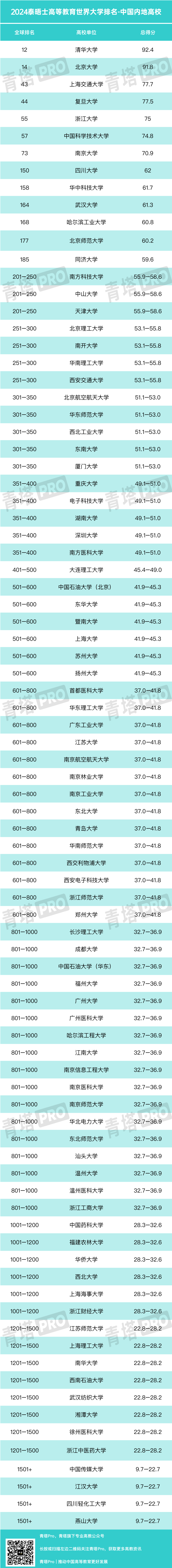 今年,中国内地高校在全球排名呈整体上升趋势。清华大学是中国内地排名最高的大学,在2024泰晤士高等教育世界大学排名中位列第12名。中国内地排名第二的大学是北京大学,位列第 14 名。