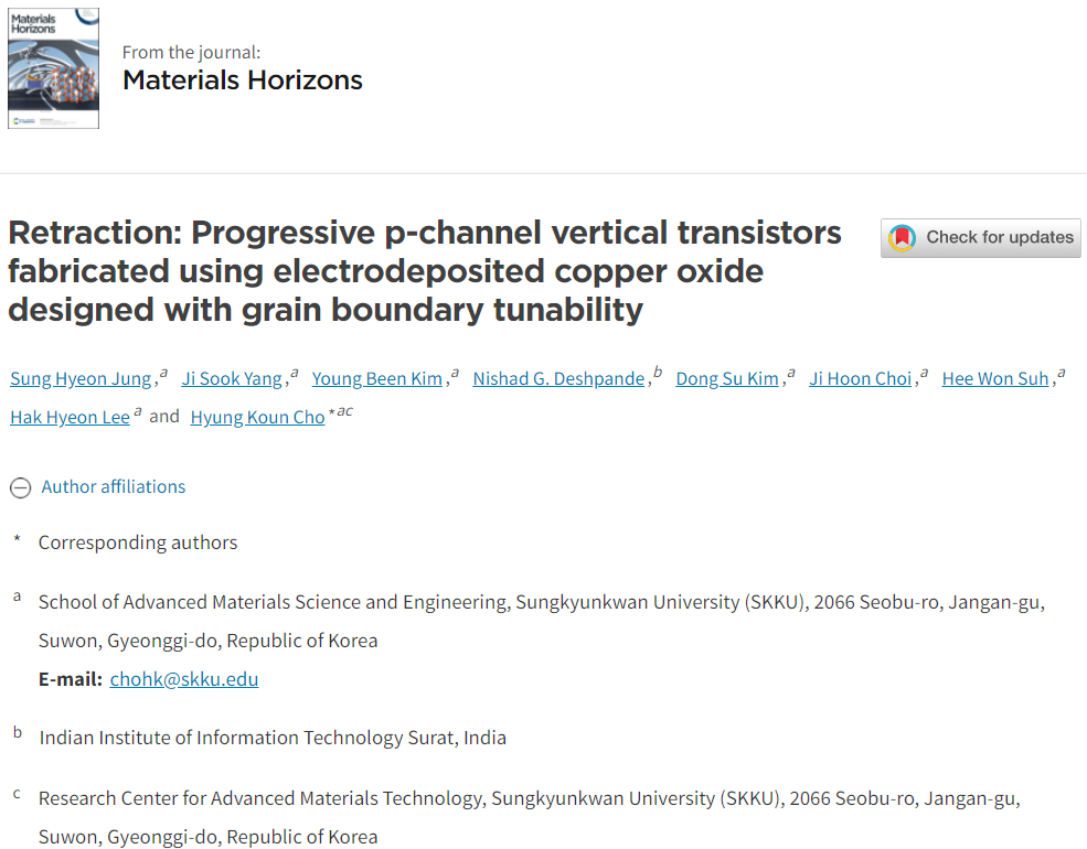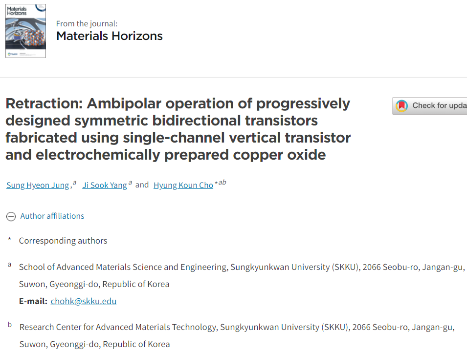 迄今为止,传统的p型氧化物半导体表现出较差的迁移率和稳定性,这阻碍了所有基于氧化物的逻辑器件的发展。此外,以往对p型氧化物晶体管的研究受到典型平面型结构的限制。2022年3月7日,韩国成均馆大学宋承贞(Sung Hyeon Jung)等人在Materials Horizons(IF=13)在线发表题为“Progressive p-channel vertical transistors fabricated using electrodeposited copper oxide designed with grain boundary tunability”的研究论文,该研究设计的加入Sb元素的Cu2O电沉积方法促进了晶界的垂直排列,并且与垂直场效应晶体管中从源极到漏极的电荷输运方向完全吻合。但是,在2023年10月18日,该文章被撤回,主要原因是结果无法重复。另外,2023年4月3日,韩国成均馆大学宋承贞(Sung Hyeon Jung)等人在Materials Horizons(IF=13)在线发表题为“Ambipolar operation of progressively designed symmetric bidirectional transistors fabricated using single-channel vertical transistor and electrochemically prepared copper oxide”的研究论文,该研究提出了一种对称双向晶体管(SBT)。该器件在单通道垂直晶体管(V-Tr)的不同偏置方向上同时实现了金属氧化物半导体场效应晶体管和TFT的“强反转”和“积累”机制。但是,在2023年10月18日,该文章被撤回,主要原因是结果无法重复。