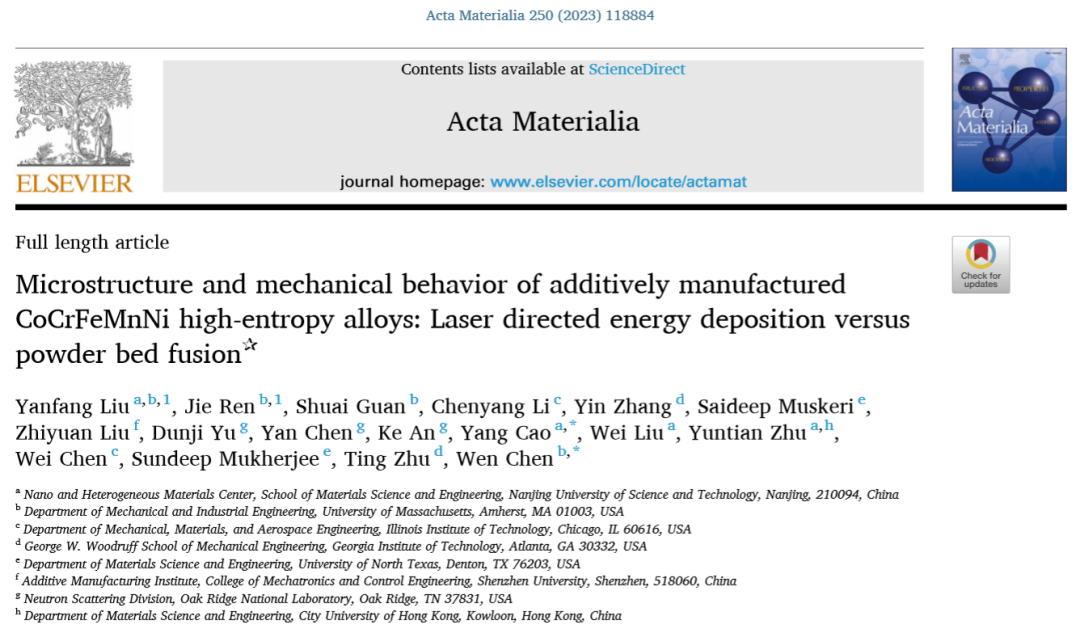 相关研究成果以题为“ Microstructure and mechanical behavior of additively manufactured CoCrFeMnNi high-entropy alloys: Laser directed energy deposition versus powder bed fusion”发表在国际期刊Acta Materialia上。