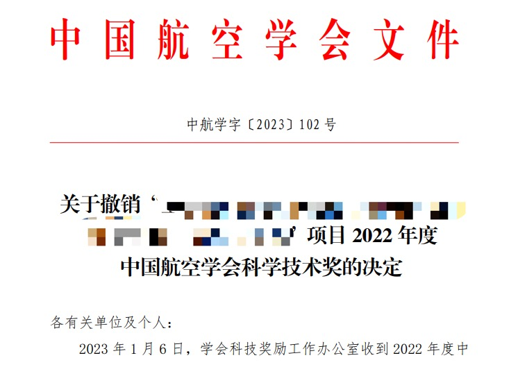 中国航空学会发布公告,撤销授予某项目的2022年度中国航空学会科学技术奖一等奖。据悉,中国航空学会科技奖励工作办公室收到2022年度中国航空学会科学技术奖一等奖获奖项目异议材料一件。根据《“中国航空学会科学技术奖”奖励办法》“凡已获得国家、省部级科学技术奖或其他社会力量设奖项目,一般不再申报或被提名本奖”条款,决定撤销授予该项目自然科学一等奖。