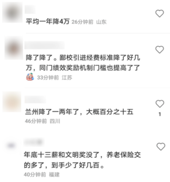 有人称,兰州已「降了一两年了,大概百分之十五」;一位 IP 定位在山东的教师表示「平均一年降 4 万」。