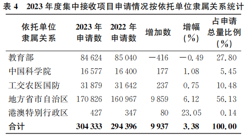 2023年度项目申请集中接收期间,除教育部所属依托单位项目申请量下降0.49%,其他各系统所属依托单位的项目申请量较2022年同期均有不同程度增加。来自地方省市自治区所属依托单位的项目申请量最大,为170826项,占总申请量的56.13%。相关统计数据见表4。