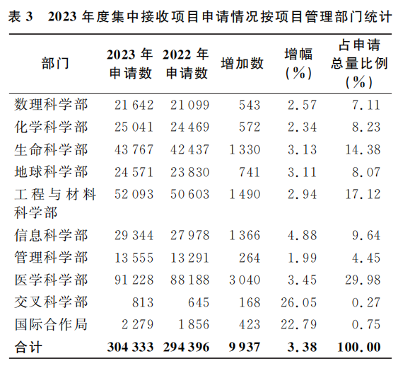 2023年,各项目管理部门集中接收的项目申请量较2022年同期相比均有所增加。其中,交叉科学部申请量增幅最高,达26.05%,其次是国际合作局和信息科学部,增幅分别为22.79%和4.88%;数理、化学、生命、地球、工程与材料、管理、医学科学部的增幅均低于3.5%。在各项目管理部门中,医学科学部的申请量仍为最高,达91228项,占比29.98%。各项目管理部门集中接收项目申请情况见表3。