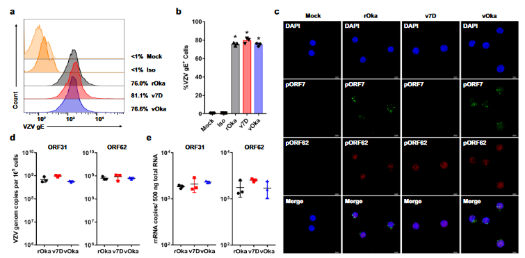 厦门大学夏宁邵教授/程通教授/张军教授和罗格斯大学Hua Zhu等人合理设计了水痘减毒活疫苗候选疫苗v7D。这种病毒像野生型病毒一样可在MRC-5成纤维细胞和人类PBMC中复制,而人类PBMC正是VZV传播的载体,其在人类皮肤和神经元细胞的感染严重受损。同时,v7D在体外和多种小动物物种中显示出与vOka相当的免疫原性。最后,v7D在非人类灵长类动物中被证明具有良好的耐受性和免疫原性。临床前数据表明,v7D是一种很有前途的候选疫苗,可以作为一种更安全的水痘活疫苗,降低疫苗相关并发症的风险,并可以为其他疱疹病毒疫苗的设计提供信息。