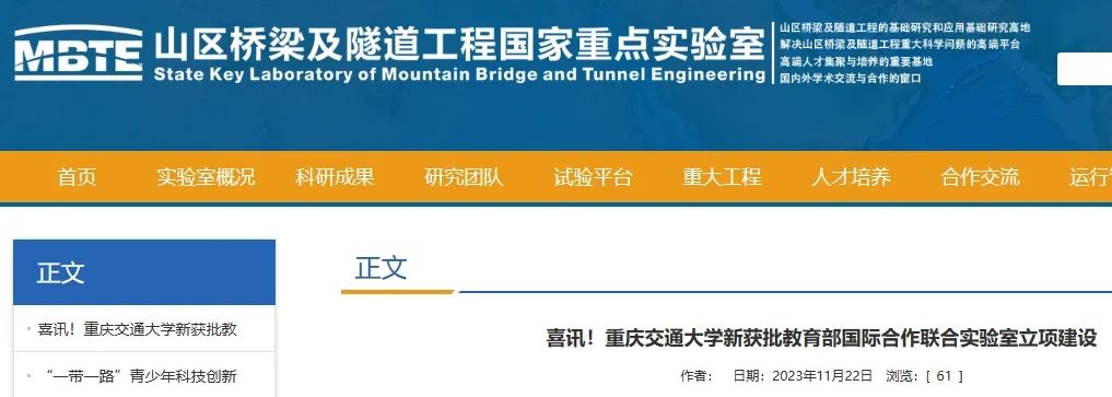 据重庆交通大学山区桥梁及隧道工程国家重点实验室11月22日消息,该校“智慧交通基础设施国际合作联合实验室”成功获批立项建设,该国际合作联合实验室也是本年度重庆市市属高校唯一获批的教育部国际合作联合实验室。