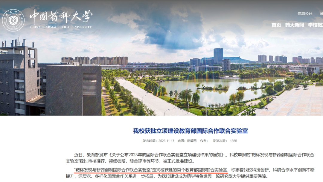 “靶标发现与新药创制国际合作联合实验室”是该校获批的首个教育部国际联合实验室,标志着我校科技创新、科研合作水平创新不断提升,深层次、多样化国际合作关系进一步拓展,为学校建设成为药学特色世界一流研究型大学提供重要保障。