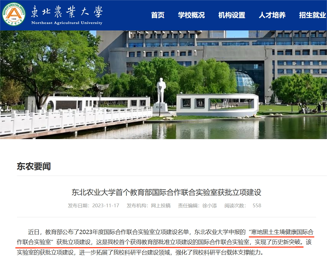 据东北农业大学11月17日消息,东北农业大学申报的“寒地黑土生境健康国际合作联合实验室”获批立项建设,这是该校首个获得教育部批准立项建设的国际合作联合实验室,实现了历史新突破。该实验室的获批立项建设,进一步拓展了东北农业大学科研平台建设领域,强化了该校科研平台载体支撑能力。