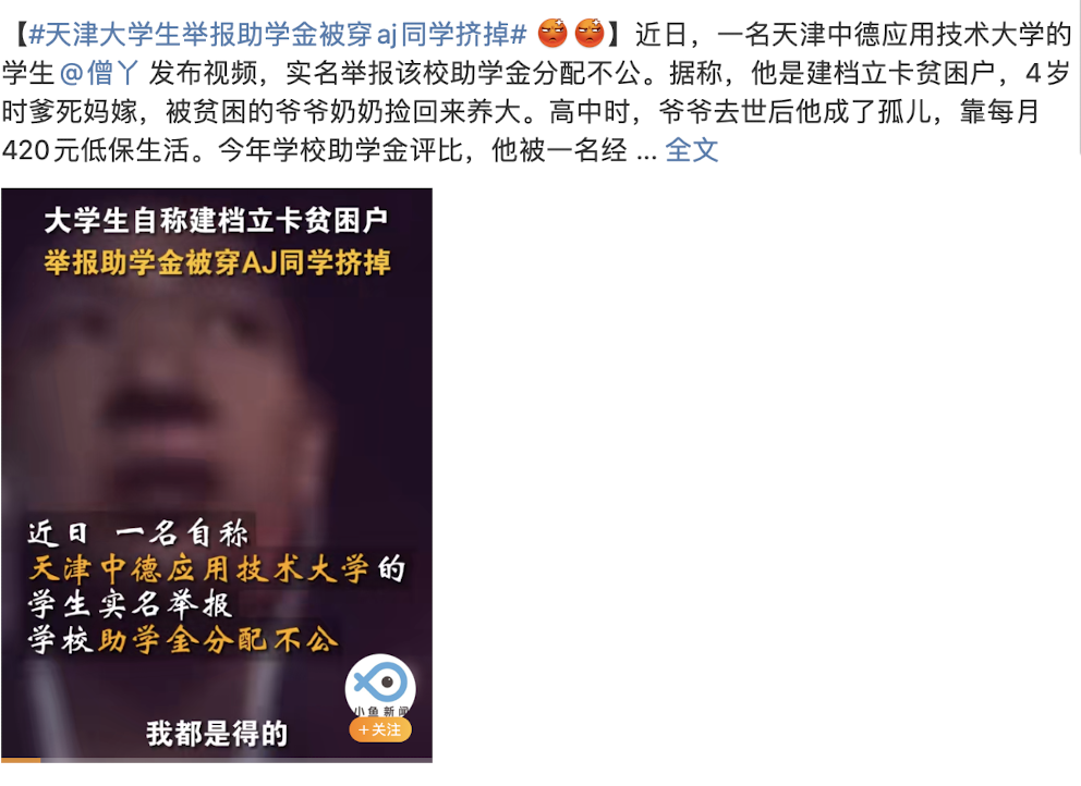 与此同时,热搜上还有另一个新闻:天津某大学有一位大学生,流着泪倾诉自己的贫困助学金名额,被一位经济状况并不差的同学给挤了下来。