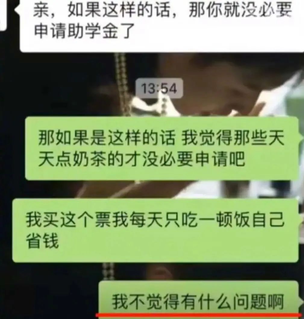 如果你有能力承担“高消费”,那请把助学金让给真正有需要的人。而不是一边拿着助学金,一边享受生活,还希望占据道德高线,得到别人的认可。