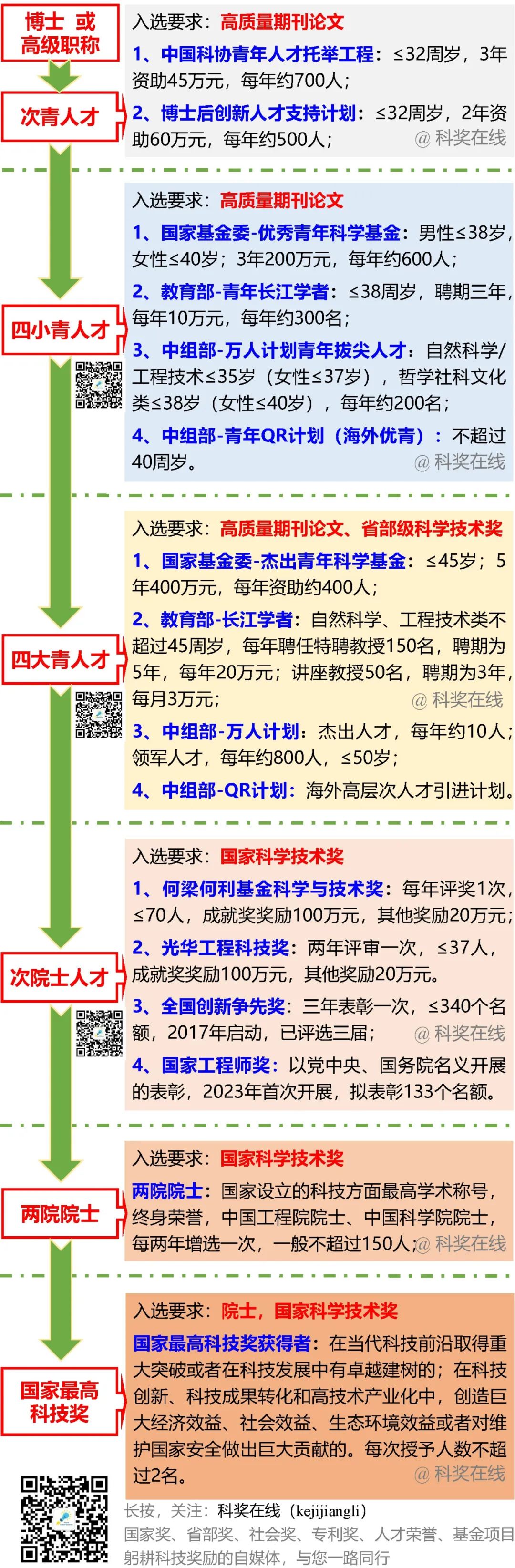 近日,2023年度两院院士公布增选名单,中国工程院增选74人、中国科学院增选59人,最年轻的45岁,最年长的76岁。两院院士是我国科技领域的最高学术称号,终身荣誉,是科研工作者的至高追求。科奖在线盘点了我国目前普遍认可的人才称号,梳理了从博士毕业到入选 院士各个阶段的人才荣誉,供大家参考。具体如下: