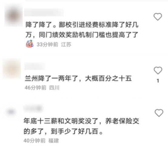 今年10月,宁波某二本院校开出博士110万元的安家费,在学术界引起不小的讨论。乍一看这个数字着实诱人,但细看其中的规定却发现这笔钱不仅是分批次发放,考核要求还相当严苛,被网友嘲讽“堪比拿诺贝尔数学奖”。 总之在当下的高校市场,绝大部分普通青椒的收入大概是我国二线城市白领的平均收入水平,而那些高收入群体也必定背负着更多的科研任务、更高的学术要求,鱼与熊掌不可兼得。 近些年一个总体的趋势是,高校教师的工作压力与收入并不成正比,并且近期各个地区都出现了“教师自爆降薪”的情况。“兰州降了一两年了,大概百分之十五”“十三薪和文明奖没了”“岗级津贴只有三千多一个月”“绩效降了”......一位IP定位在山东的教师甚至表示“平均一年降4万”。