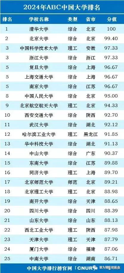 而在清北之后,ABC评选的结果就比较有意思了。排在第三的是中国科学技术大学和浙江大学,两者以97.33的高分并列全国第三,而中科大和浙大身后的高校则是另外三所华五高校复旦大学、上海交通大学和南京大学,总体还是呈现一个清北+华五的趋势,但是华五内部分成了两大集团。所以此份榜单的一出,使得第三强高校的竞争变得更加的扑朔迷离!不知道各位对于华五集团内部的排名,是否和此榜一样呢?