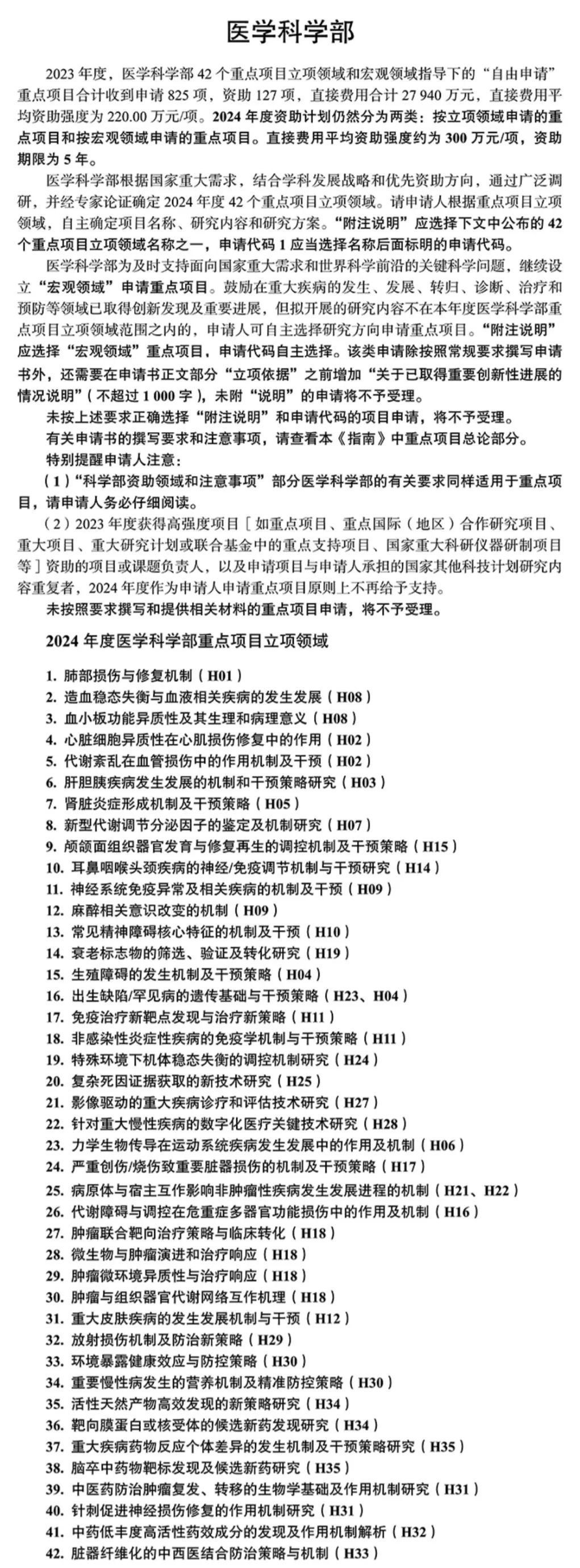 近日,《2024年度国家自然科学基金项目指南》正式发布,其中重点项目支持从事基础研究的科学技术人员针对已有较好基础的研究方向或学科生长点开展深入、系统的创新性研究,促进学科发展,推动若干重要领域或科学前沿取得突破。为更好地服务广大科技工作者,小编对指南中各学部重点项目的优先资助领域进行了梳理,仅供参考。具体内容请参见国家自然科学基金委员会官方网站。 数学物理科学部 化学科学部 生命科学部 地球科学部 工程与材料科学部 信息科学部 管理科学部 医学科学部