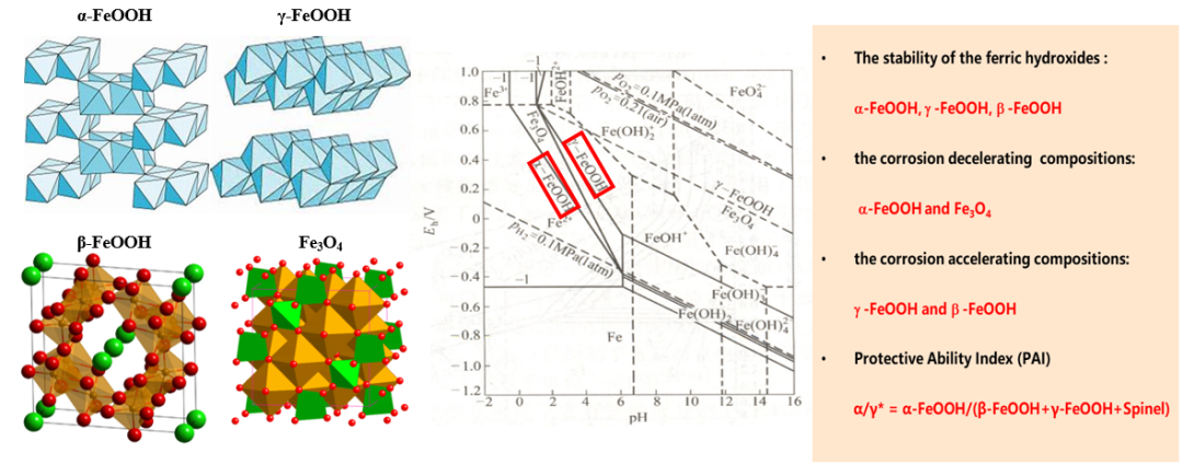 锈层中影响低碳钢大气腐蚀行为的主要组分为α-FeOOH、β-FeOOH、γ-FeOOH和Fe3O4。根据Fe-H2O体系的Pourbaix图,α-FeOOH为最稳定的组分,对大气腐蚀有抑制作用,γ-FeOOH、β-FeOOH依次为越来越不稳定的组分,容易通过阴极还原反应转化为Fe3O4。α-FeOOH和Fe3O4对薄液膜中腐蚀性组分的输运有更强的阻挡作用。