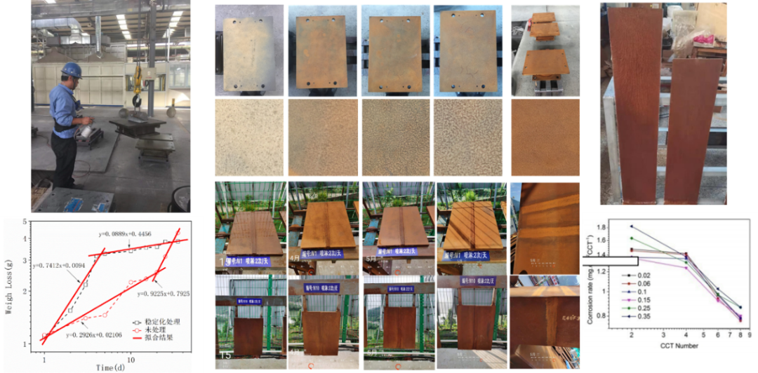 根据耐候钢锈蚀演化规律,我们与南钢合作,提出以腐蚀速度升高和下降的时间转折点作为锈层稳定化的判据,发展了一种利用化学处理液控制锈层组分的稳定化技术。分别在南钢、福建沙溪高速特大桥以及衡水中铁建公司现场进行了耐候钢锈层稳定化试验,可以在两天内实现锈层稳定化。