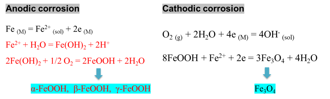 低碳钢的大气腐蚀是在薄液膜下由铁的阳极溶解和溶解氧的阴极还原共同驱动下发生的,腐蚀产物即为铁锈。随着时间的延长,锈层中的水解产物因与O2的作用以及环境中污染组分的作用而转变成具有不同化学稳定性的Fe(III)羟基氧化物。一方面,这些锈层组分对薄液膜中的组分传输起到抑制作用,另一方面,具有不同构型的羟基氧化铁可以阴极还原为Fe3O4,且其还原活性显著不同。在大气腐蚀后期,不同锈层组分的这种还原活性差异及其演化规律成为影响低碳钢大气腐蚀行为的决定因素。
