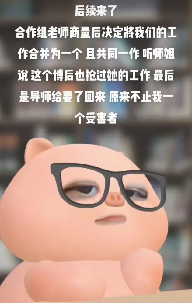 看来女博士最终还是选择了相信导师,寻求他的帮助,好在导师给力,没有置之不理,而通过这件事,她才知道原来这个博士后不是“初犯”,自己也不是第一个“受害者”,同门师姐透露:这个博士后也抢过自己的工作,不过那个时候发现的早,最后是导师给要回来了。