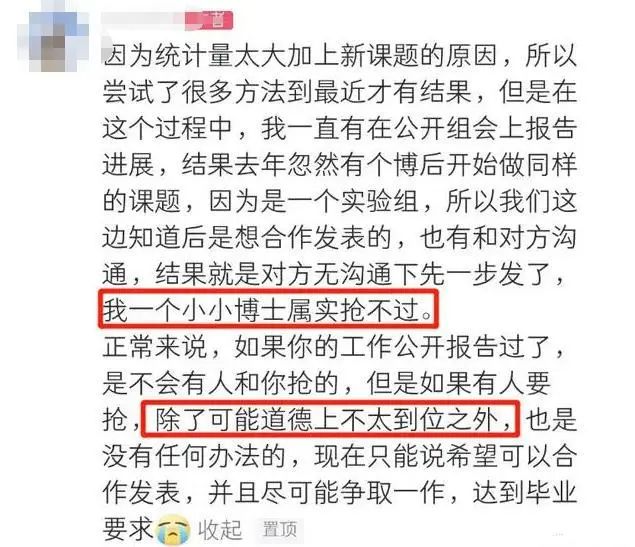 她在留言中写到:“因为统计量太大加上新课题的原因,所以尝试了很多方法到最近才有结果,但是在这个过程中,我一直有在公开组会上报告进展,结果去年忽然有个博后开始做同样的课题,因为是一个实验组,所以我们这边知道后是想合作发表的,也有和对方沟通,结果就是对方无沟通下先一步发了,我一个小小博士属实抢不过。