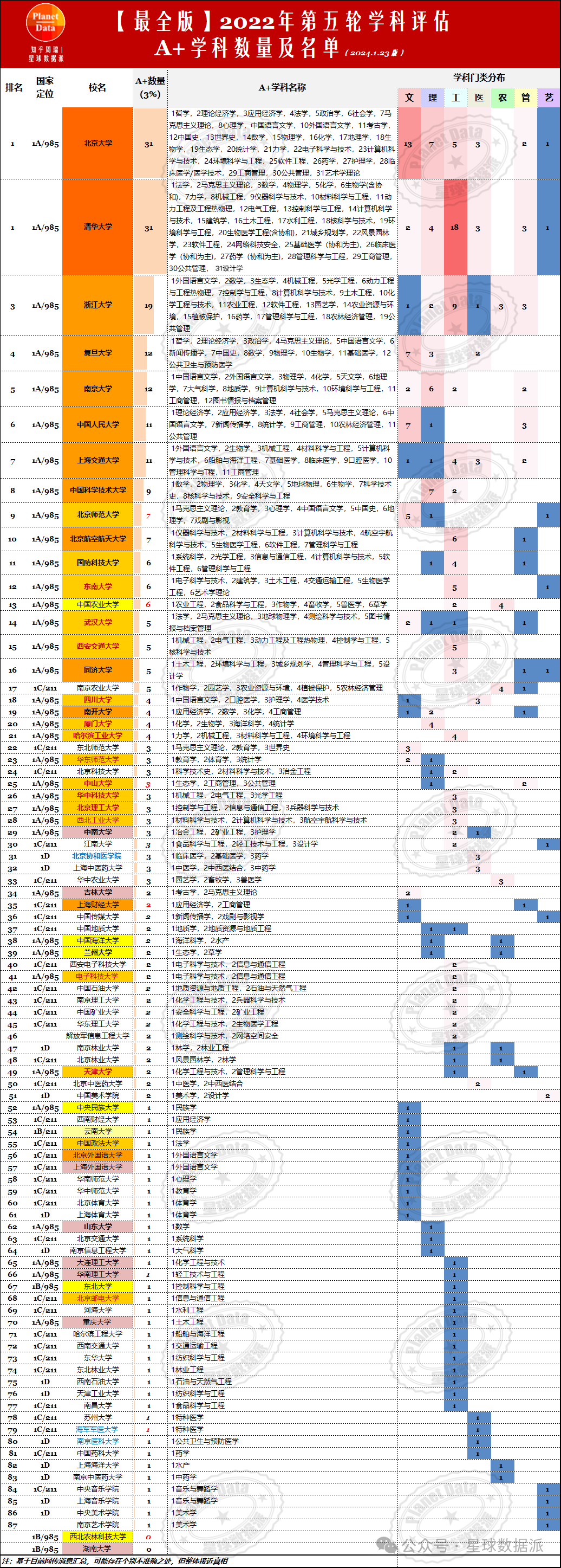 本文就将基于目前最新网传数据所整理的主要985、211名校的A+学科数量及完整名单,对各校的王牌学科进行盘点,以期为2024年高考的广大考生和家长提供系统全面的名校择校参考基准。