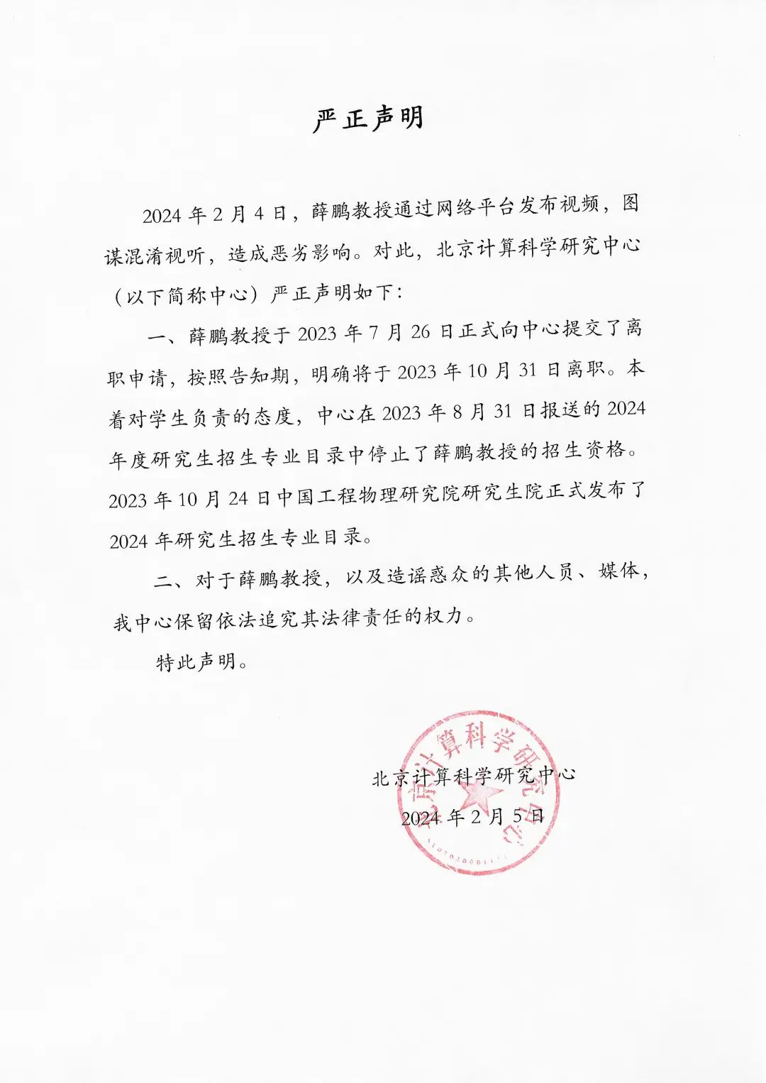 是的,基本就是仅次于院士了,某个领域年青大牛才能申请到。所以很难想象,这样级别的教授,是如何的委屈和无奈,需要在新春佳节之际,通过实名网络来求助......据介绍,北京计算科学研究中心(简称CSRC)于2009年8月成立,是中国工程物理研究院设立的二级法人单位,是以计算科学为牵引的多学科基础研究机构。2月5日8点05分, 北京计算科学研究中心在其官网上发布“严正声明”,直指薛鹏试图混淆视听,造成恶劣影响,并指薛鹏已经在早前离职: