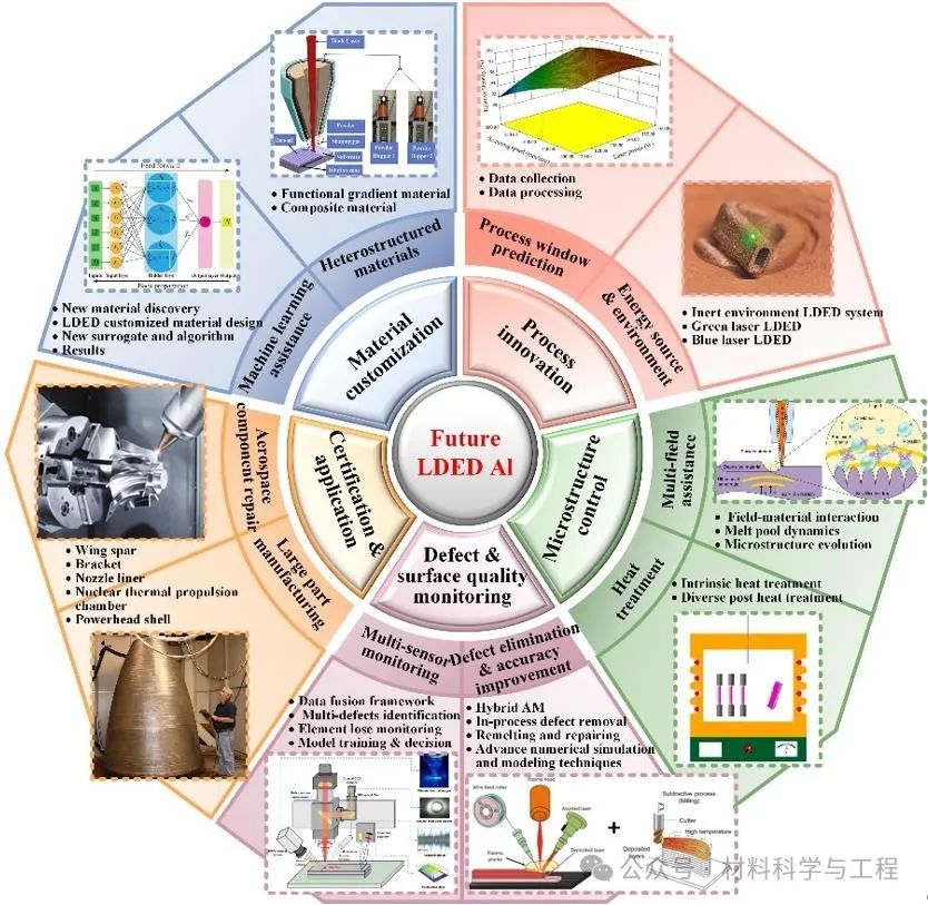 高端的航空航天公司(如劳斯莱斯和波音)对用于航空航天和维护、修理和全面改造的高强度铝合金部件的需求不断增加。为了填补研发与工业应用之间的差距,未来在LDED铝合金材料、工艺、缺陷监测和微观结构控制方面的创新对于进一步提高铝合金的可印刷性和性能,推动其工程认证和应用至关重要 (如图26所示)。(1) 在材料的定制方面:易烧损合金元素补偿、加入脱氧元素、通过物理热裂模型预测热裂敏感性与合金成分之间的关系、以及机器学习等策略可以有效地辅助LDED铝合金的成分设计和定制,从而节省了试错过程的成本和时间。(2) 在工艺创新方面:通过适当的算法可以实现工艺参数的优化设计和工艺窗口的预测。基于一些实用的模型训练,可以准确预测特定参数下缺陷发生的概率并实时监测和补偿原料成分。此外,铝合金对绿色或蓝色激光具有更高的吸收率,可以实现更高效率的近净形结构制造。(3)在微观组织结构控制方面:析出相、细小等轴晶和混晶组织均表现出高效的强化能力。未来可以尝试多种有效的热处理策略,多种能量场辅助设计,以提高LDED铝合金的可打印性和可成形性。(4) 在缺陷和表面质量监控方面:在对制件质量控制要求严格的情况下,可以推广在线缺陷检测。通过对信号特征的提取和可视化,训练模型可以检测、分类和预测相应的缺陷和尺寸误差。(5) 在工程认证方面:与传统的铸造和塑性成形相比,LDED是一种新兴的制造技术,这意味着需要经过严格的工程认证以及新的检验标准和程序作为基准和参考。(文/刘天舒)