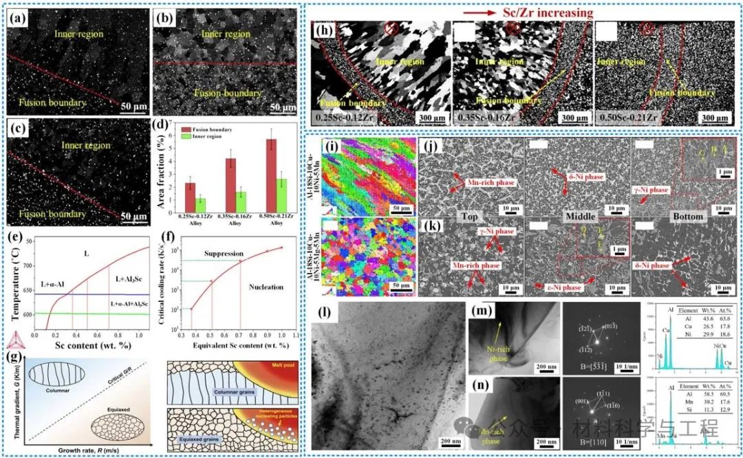 合金成分会影响LDED铝合金的凝固行为、晶粒生长和析出行为。例如,添加Sc和Zr因其在改变凝固范围、细化组织和强化析出相方面的优异效果而受到广泛关注。如图6,Sc和Zr在铝中的最大固溶度分别仅为0.35 wt.%和0.26 wt.%,但快速凝固可使铝基体中Sc和Zr的含量增加几个数量级。初生Al3(Sc, Zr)颗粒可以在熔池内和边界析出,且Sc/Zr含量的增加促进了Al3(Sc, Zr)颗粒的成核。LDED铝合金具有较高的热梯度,通常导致柱状晶粒的形成。而初生Al3(Sc,Zr)颗粒可促进铝的异质形核,形成等轴晶。此外,人工时效过程中形成的次生Al3(Sc, Zr)也具有高效的强化作用。Zr可以显著延缓析出相的粗化,并扩散到Al3Sc中形成具有核壳结构的次生Al3(Sc, Zr),并可以有效降低铝合金的固液界面能和表面张力,从而降低铝合金的粘度,改善铝熔池固有的流动性差的问题。此外,通常还采用Si元素诱导形成低熔点的Al-Si共晶相来降低LDED铝合金工件的高热裂敏感性。近年来还发现Ce可以通过在快速凝固过程中形成具有优异的抗粗化能力的Al11Ce3显著提高LDED铝合金的高温稳定性。此外,Mg的加入也可促进了α-Al晶粒由粗柱状向细等轴状转变并阻碍δ相向γ相转变。同时,也有利于形成具有较好力学性能的Al15Mn3Si2相。