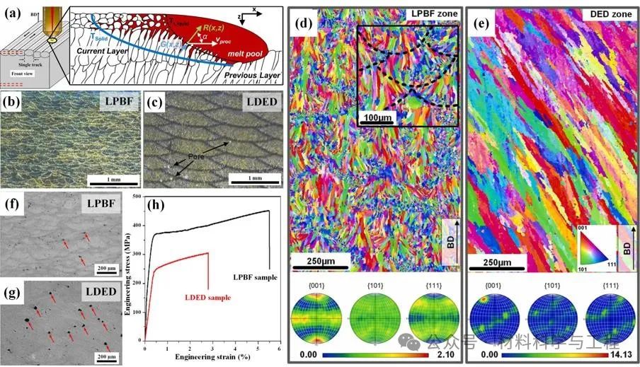 图2 LDED和LPBF加工铝合金的组织和力学性能比较。(a)激光加工后材料的凝固行为。(b)和(d) LPBF铝合金的典型显微组织。 (c)和(e) LDED铝合金的典型显微组织。(f)和(g) LPBF和LDED铝合金的光学显微结构。(h) LDED和LPBF处理同一种铝合金的应力应变曲线。