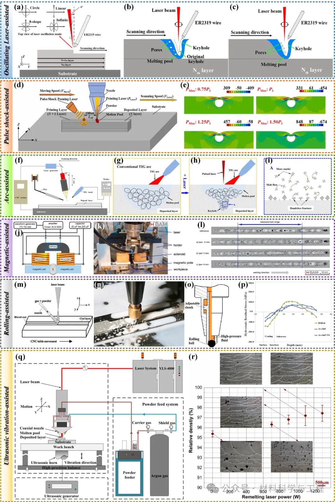 图9场辅助铝合金LDED。(a) 振荡激光辅助LDED原理图。(b)和(c)激光光斑振荡对孔隙分布的影响:(b) t+0 s;(c) t+1 s。(d)激光冲击锤击辅助LDED的原理图。(e)不同最大压力下激波作用下孔隙闭合机制示意图。(f)激光-电弧混合增材制造系统示意图。(g)-(i)晶粒细化机理图:(g)单Tig熔池。(h)激光- Tig混合熔池。(i) (h)中A区域的放大。(j)磁场辅助LDED的原理图。 (k)电磁场下的激光焊接系统。(l)无磁场或有磁场时AlMg3合金焊缝孔隙分布。 (m) 轧制辅助LDED的原理图。(n)和(o)计算机数控机床对激光熔覆试样的深表面滚压加工。(p)激光包覆样品中流体静力应力的中子衍射结果。(q) 4047铝合金超声振动辅助LDED工艺示意图。(r)超声振动辅助LDED制备的4047铝合金在不同激光重熔功率下的OM图。(插图)经许可使用。