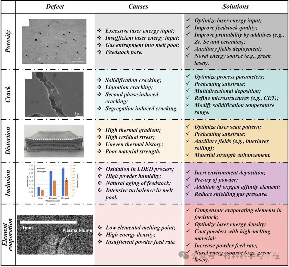 综上所述,我们对常见的LDED加工铝合金过程中容易出现的缺陷以及其产生原因和相应的解决措施进行了总结和归纳,如图13所示。