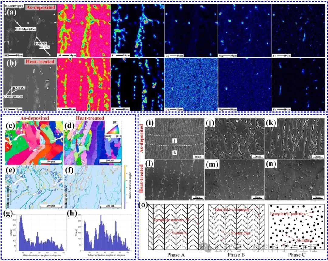 图11后热处理对LDED铝合金组织形态的影响。(a)和(b)分别为沉积态和热处理态Al-5Si-1Cu-Mg合金的背散射电子图和相应的波长色散X射线光谱元素分布图。 (c)和(d)分别为沉积态和热处理态LDED Al 7075合金的EBSD图。(e)和(f) Al 7075合金沉积态和热处理态晶界取向图。(g)和(h)沉积态和热处理Al 7075合金的晶界取向角分布统计。(i)沉积态Al-5Si-1Cu-Mg的SEM图。(j)和(k)分别为(i)中j和k区的放大图。(l-n) 450 °C @ 6 h、500 °C @ 6 h和550 °C @ 6 h后LDED Al-5Si-1Cu-Mg样品的SEM图。(o) LDED AlSi10Mg热处理过程中Si相演化示意图。(插图)经许可使用。