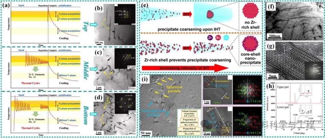 图10本征热处理对LDED铝合金析出相的影响。(a) LDED过程中2A97 Al-Li合金热循环和析出相的区域差异机理图。(b-d) LDED 2A97 Al-Li合金沿构建方向不同区域的亮场TEM图像和SAED图。 (e)从LDED Scalmalloy 合金和AlSc1.0Zr0.4合金底部进行的原子探针层析成像。(f)和(g) Al-5.32Si-1.19Cu-0.46 Mg-0.09Fe合金中纳米级Q′相的TEM和HRTEM图。(h) Al-5.32Si-1.19Cu-0.46 Mg-0.09Fe样品顶、底区XRD谱图比较。(i) LDED AlSi10Mg合金的亮场TEM图和球形和非球形Si相。