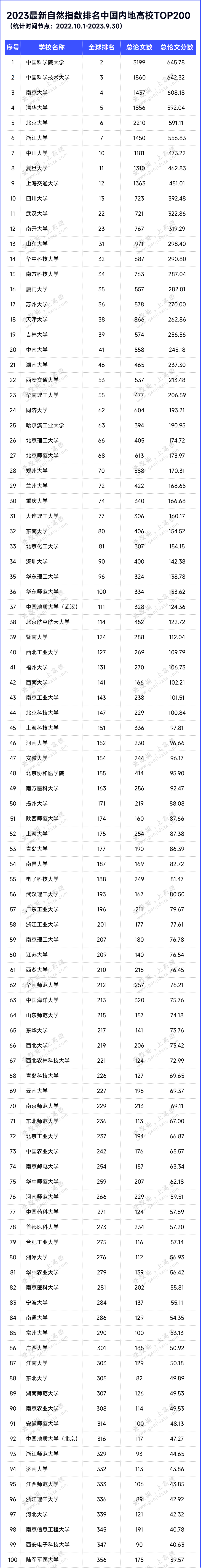 2024最新自然指数排名中国内地高校TOP200名单(2022.10.1-2023.9.30)如下: