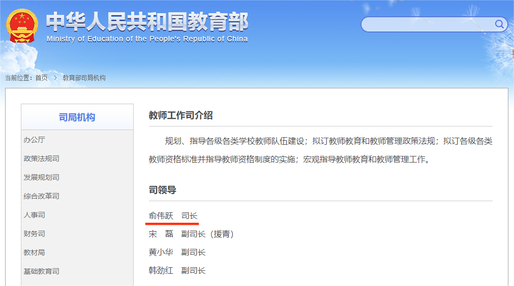 近日,教育部网站“教师工作司”页面更新,俞伟跃任教师工作司司长。