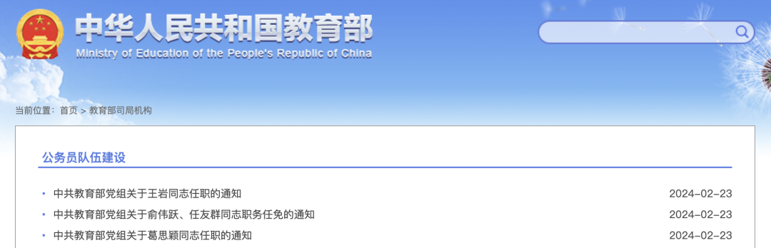 2月23日,教育部网站更新了三则人事任免消息:王岩同志为高校学生司(高校毕业生就业服务司)副司长(挂职);葛思颖同志为中国联合国教科文组织全国委员会秘书处副秘书长;俞伟跃同志为教师工作司司长。
