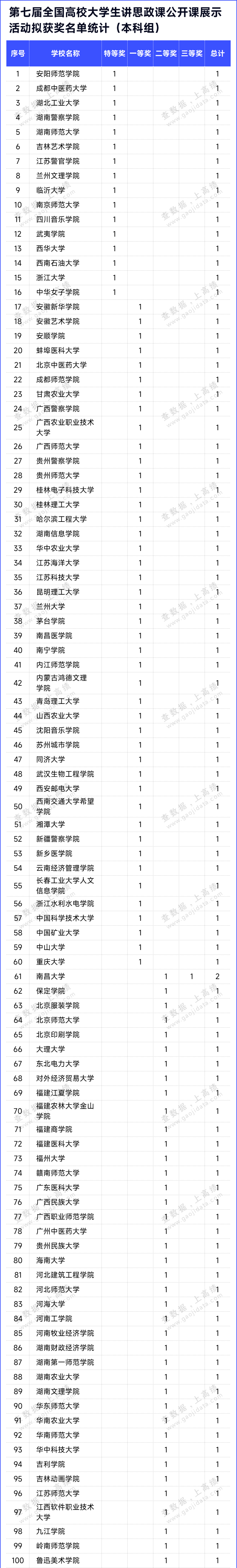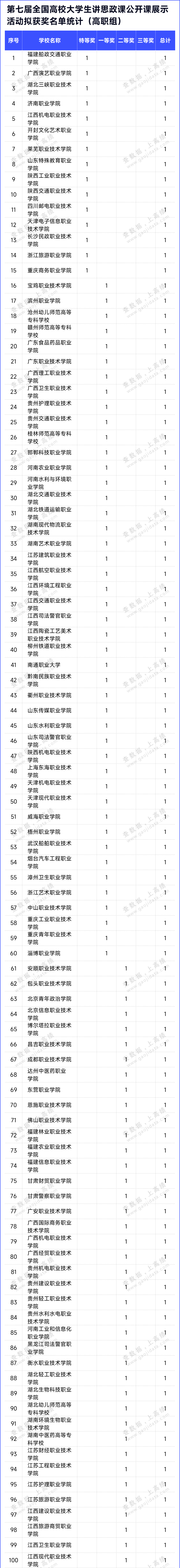 在本届全国高校大学生讲思政课公开课活动评选结果中,共有299所高校拟获高职组奖项。其中,特等奖15项、一等奖45项、二等奖90项、三等奖149项。